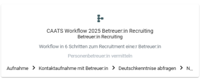 Nach Auswahl der Workflows-Seite im linken Menü kann durch einen Klick auf Erstellen rechts oben eine Übersicht der für Ihre Organisation und Ihre Rolle verfügbaren Workflows geladen werden. Ein gängiger Workflow ist dabei der hier näher beschriebene Workflow 2025 - Recruiting, der in 6 Schritten von der ersten Kontaktaufnahme einer neuen Betreuer:in bis zur Vermittlung an eine Familie führt.