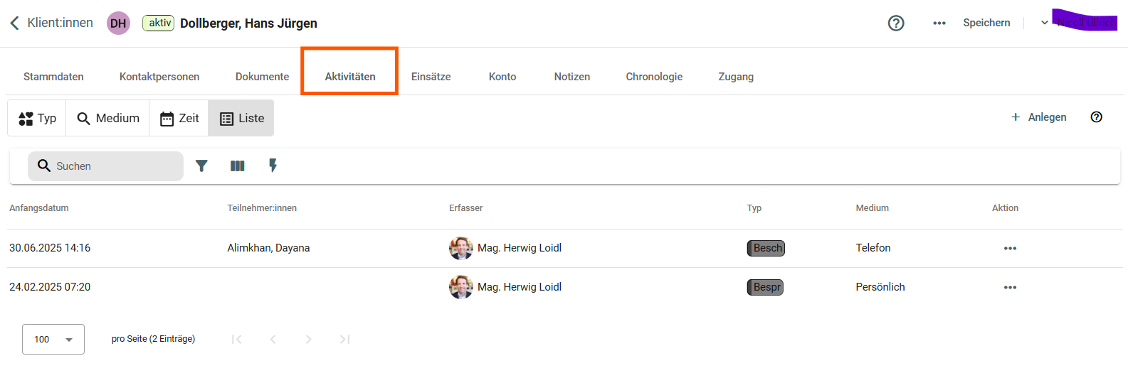 Im Reiter „Aktivitäten“ werden alle dokumentierten Kontakte, Gespräche und Maßnahmen zur ausgewählten Person erfasst.